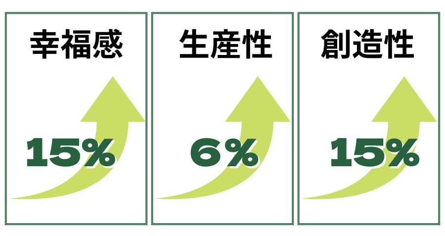 オフィスグリーンの導入は、働く人々の「幸福度」「生産性」「創造性」と密接な関わりがあることがわかっています。
