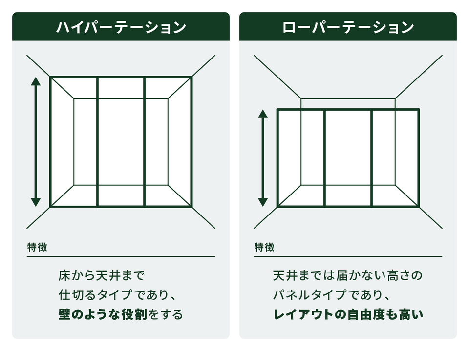 ハイパーティションもしくはロータイプパーティションを設置して、空間を仕切る方法です。ハイパーティションは床から天井までを仕切るタイプ、ローパーティションは天井まで届かない高さのタイプのものを指します。