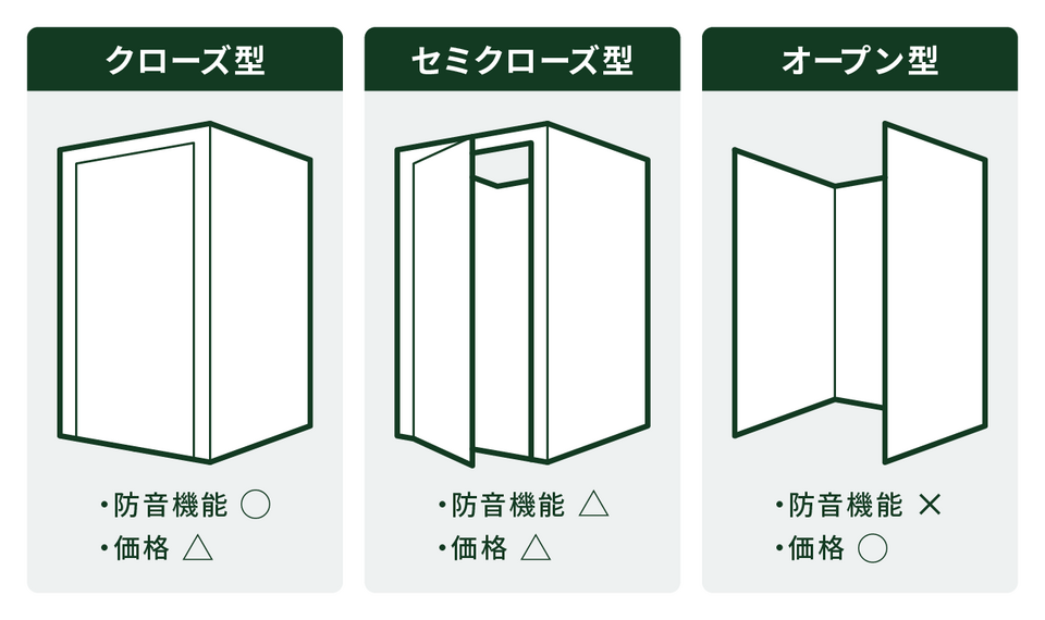 個室ブースには「クローズ型」「セミクローズ型」「オープン型」の3種類があります。それぞれの特徴とメリット・デメリットを確認しておきましょう。