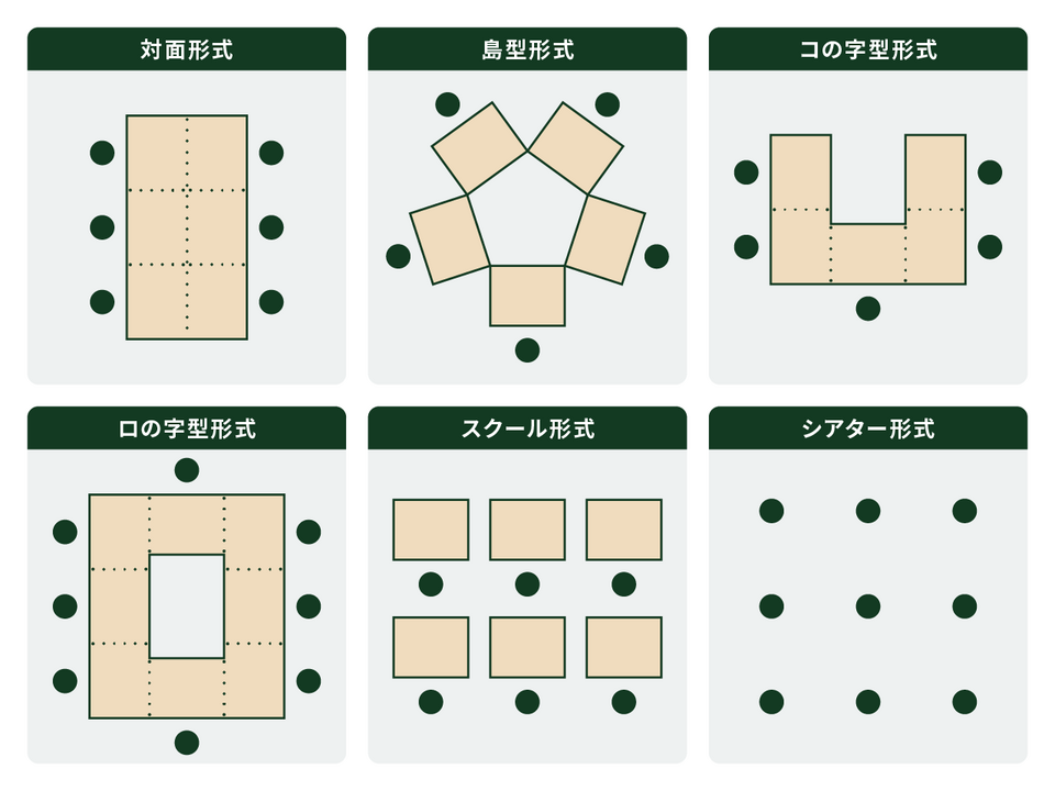 少人数ずつ、複数のテーブルに分かれて座る形式のレイアウトです。小単位での議論や意見交換のほか、スペースが限られている場所にも設置しやすいレイアウトといえます。ワークショップなどの開催時にも活用できるでしょう。