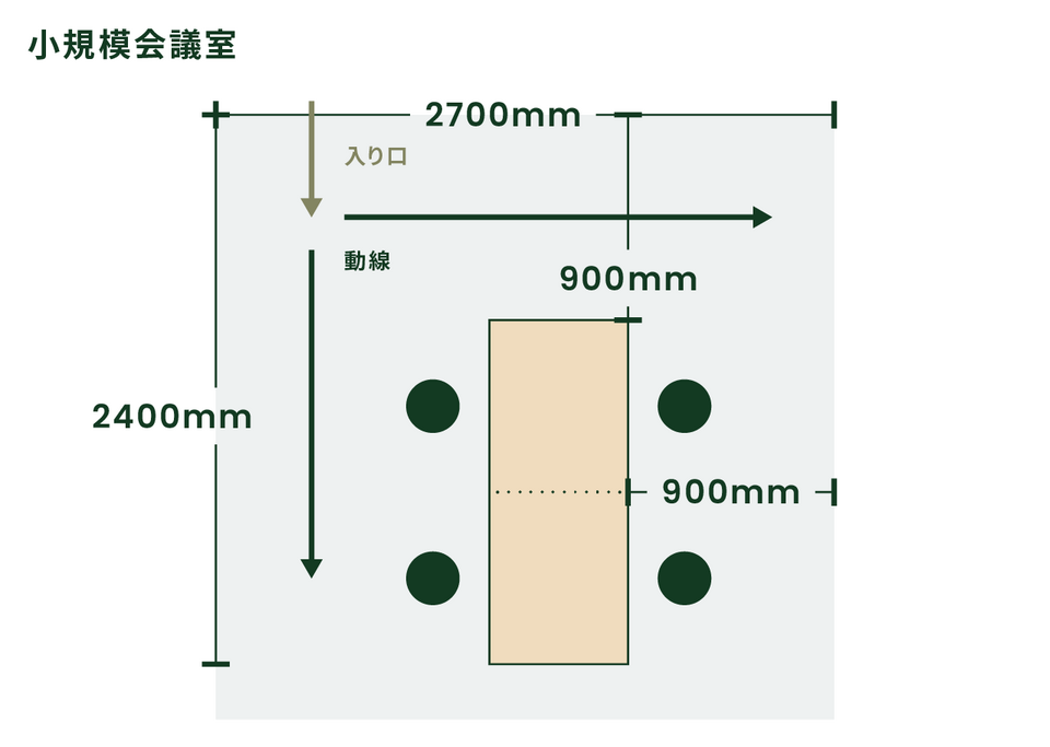 6人程度までが利用する小規模な会議室の場合、6〜14平方メートル程度の面積が適しています。テーブル脇の通路を900mm程度確保することで、通行しやすく圧迫感の少ない空間になるでしょう。ただし、肘つきの椅子を利用する場合には、さらに余裕のある広さが必要になることもあります。