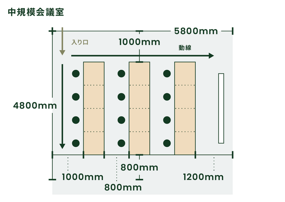 10名程度までが利用する中規模会議室に関しては、24〜30平方メートル程度の面積が適しています。通行しやすく圧迫感の少ない空間にするには、テーブル脇の通路を1000mm程度確保しましょう。