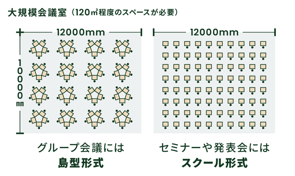 30名以上が利用する大規模会議室の場合は、120平方メートル程度の面積を確保する必要があります。複数のテーブルを配置する場合には、参加者が椅子を引いたときに狭いと感じないよう、余裕のあるレイアウトを検討しましょう。
