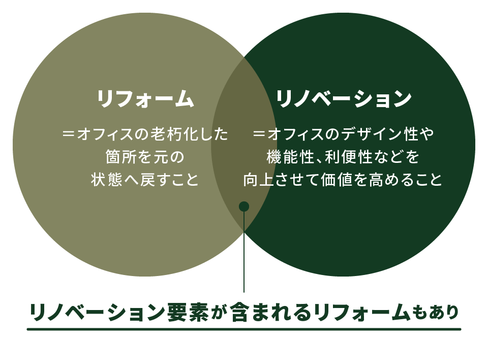 オフィスのリフォームについて調べている中で、「リノベーション」という言葉を見かけた方も少なくないでしょう。リフォームとリノベーションはどう違うのでしょうか。![]()