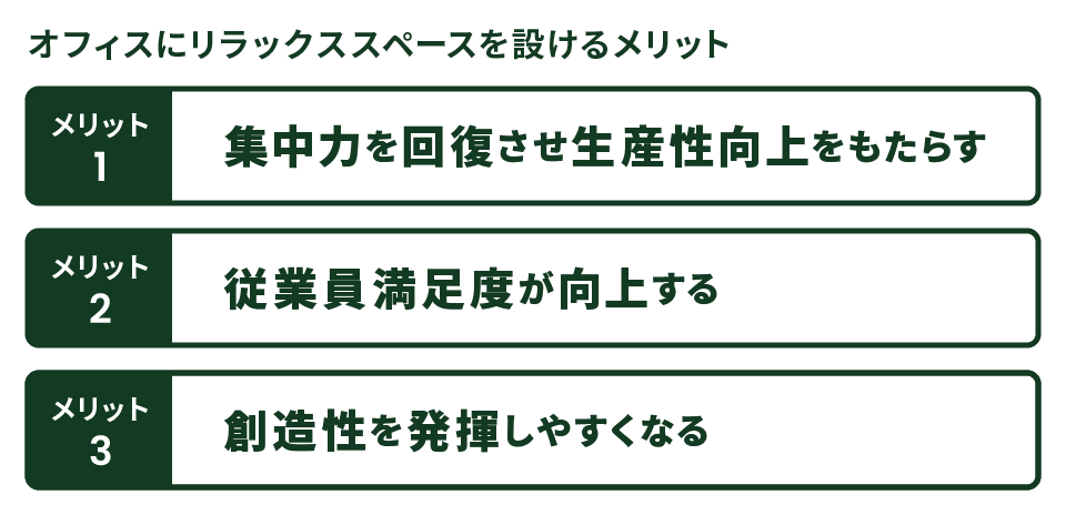 オフィス内にリラックススペースが設けられることによって、具体的にどのようなメリットを得られるのでしょうか。主な3つのメリットを紹介します。